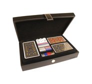 Descrizione prodotto: cofanetto carte e fiches facon pelle, chiusura magnetica. 2 mazzi di 54 cartes1 Tarocchi DOS concorde6 dadi e 3 serie di gettoni.