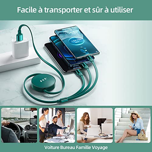 【Design retrattile e facile da trasportare】: il cavo del caricatore del telefono supporta 5 tipi di lunghezza regolabile, fino a 1,1 m (3,6 piedi). In particolare, non solo può essere allungato in due direzioni, ma anche in una direzione, che è comodo da usare in varie scene. AVVISO: alcune spine ad alta tensione potrebbero causare il mancato caricamento delle altre due porte quando la porta di tipo C è in carica. Si prega di sostituirlo!