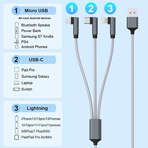 【Design Della Spina Ad Angolo Di 90 Gradi】: questo cavo di ricarica multipla a 90 gradi presenta un innovativo design a forma di "L" e una luce LED a forma di anello, che lo rende più comodo e comodo giocare, perfetto per i giocatori. Guarda video e leggi e-book durante la ricarica. Design a forma di L, doppia protezione della rete di nylon, riduzione della flessione durante l'uso, protezione dell'interfaccia, prevenzione della piegatura e rottura del cavo dati e prolungamento della durata.
