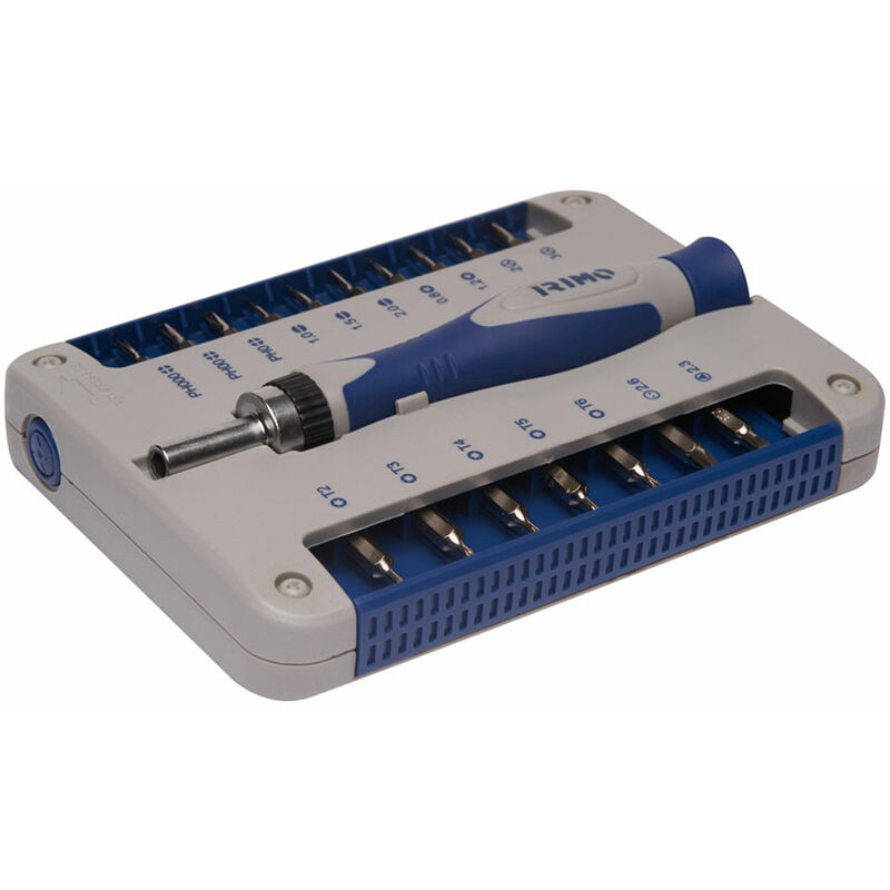 Cacciavite di precisione con portabit a cricchetto, 17 pezzi 471-18-1 irimo. include cacciavite di precisione a cricchetto con portabit magnetico e 17 bit da 5/32. bit: 5/32. per applicazioni di ingegneria ed elettronica di precisione. -Bit: 1,0, 1,5 e 2,0 mm. -Phillips: ph000, ph00 e ph0. -Torx: t2, t3, t4, t5 e t6. -p: p0,8 e p1. -y: y2.0 e y3.0. -ta: 2,3. corsa fluida del cricchetto, meccanismo a cricchetto con tre posizioni: avanti, indietro e neutro. l'impugnatura bicomponente offre il massimo comfort. la testa girevole consente un utilizzo facile e preciso. in una valigetta di plastica compatta. le guide facilitano la rimozione e l'inserimento delle punte. in confezione blister. din 3126-c 4 e iso 1173.
