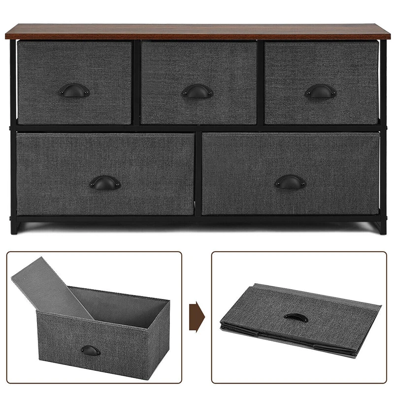 Multifunction Wood Dresser Organizer Unit Side Table Display Steel Frame 5 Folding Removable Fabric Drawers Storage Cabinet