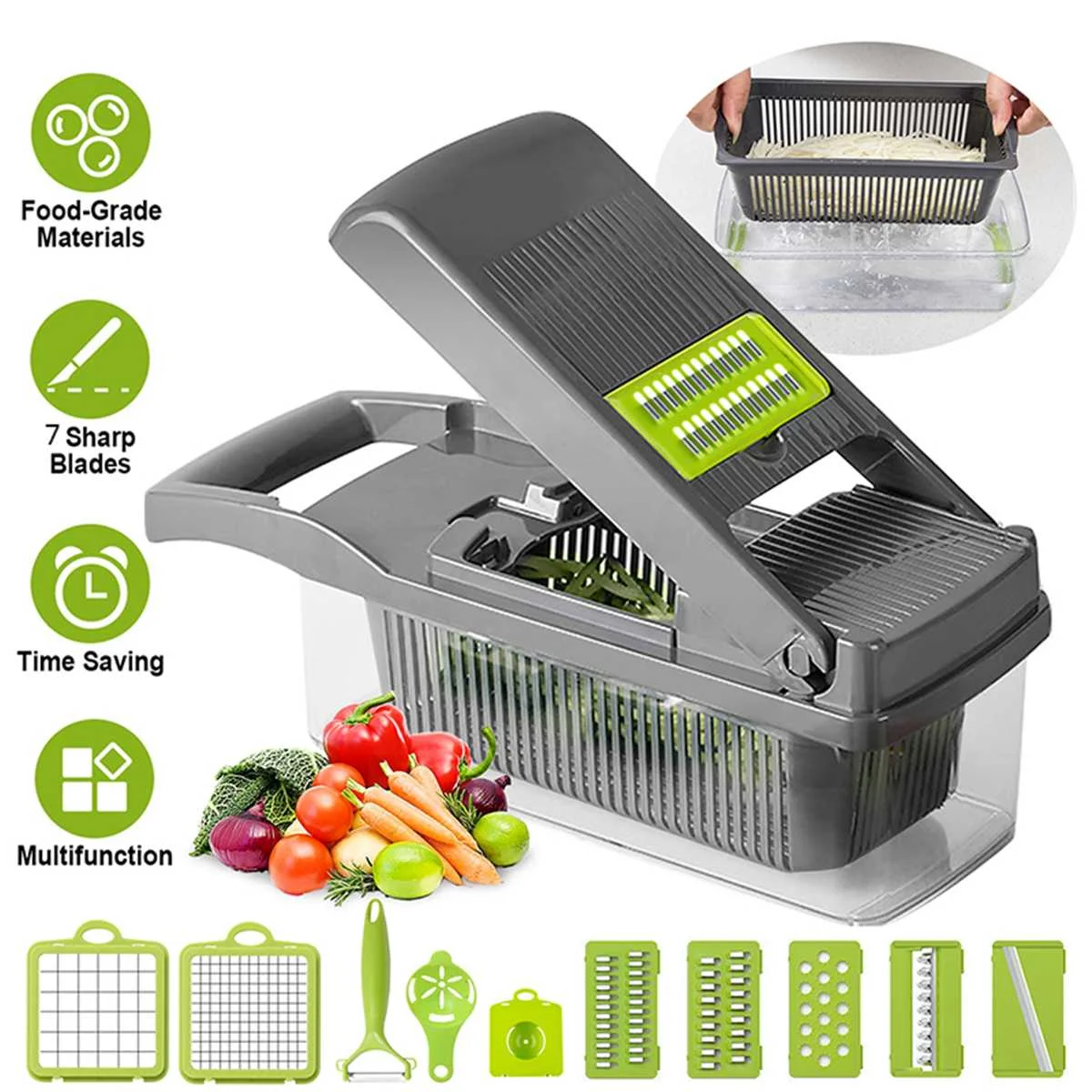 Multifunctional 7 Blades egetable Cutter Fruit Slicer Grater Shredders Drain Basket Slicers Potato Peeler Carrot Grater Kitchen