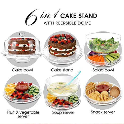 【Vassoio per torte 6 in 1】 Il nostro vassoio per torte ha molte funzioni e usi, puoi servire quasi tutto su questo vassoio, come: verdure, snack, noci, biscotti e altro ancora. Può anche essere conservato separatamente o come piatto da insalata, oppure utilizzare il coperchio e la base separatamente e contenere patatine, frutta e altri snack.