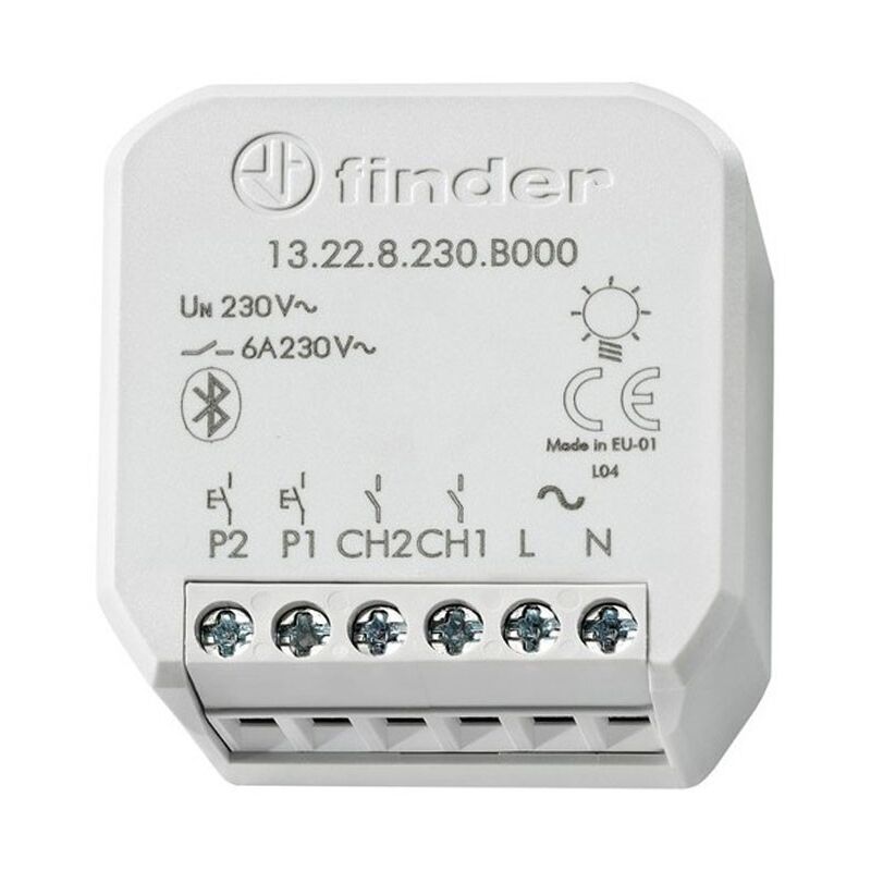 Relè multifunzione Bluetooth Finder YESLY 2 canali (attuatore interruttore YESLY) per installazione ad incasso: Tensione di alimentazione: 230 V CA (50 / 60 Hz) Carico lampada: 200 W / 230 V CA 2 canali programmabili 20 funzioni selezionabili 2 ingressi per pulsanti cablati 2 contatti NA per 6 A / 250 V CA Materiale di contatto: AgSnO2 Distanza di trasmissione circa 10 metri nello spazio libero (senza ostacoli) CON L'APPLICAZIONE FINDER TOOLBOX Con la App Finder Toolbox si potrà: Impostare le funzioni, le sequenze e le temporizzazioni (T1, T2) sui canali Ch1 - Ch2 Associare i pulsanti wireless Impostare gli scenari NOTE Range di trasmissione: circa 10 m in campo libero ed in assenza di ostacoli Il range di trasmissione può variare in base alla struttura dell'edificio (Esempi): Muri in cemento armato e/o pareti metalliche Muri leggeri riempiti di lana isolante su fogli metallici Controsoffitti con pannelli in metallo o in fibra di carbonio Vetro o vetro di piombo con rivestimento in