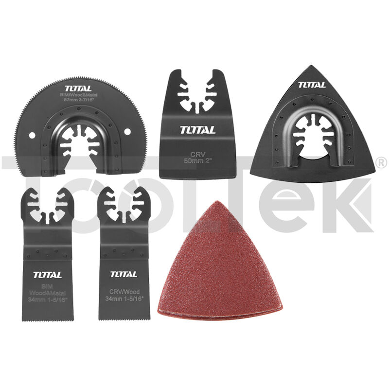 Set 15 lame per utensili multifunzione TOTAL Composizione: 1 lama Bi-Metal segmentata diametro 87 mm 1 platorello per levigatura 10 fogli abrasivi 1 lama CrV per taglio legno da 34mm 1 lama Bi-Metal per taglio metallo da 34 mm 1 raschietto Compatibile con: ut. multifunzione Total Art. TMLI2001 e con gli utensili oscillanti delle migliori marche Prodotto di qualità