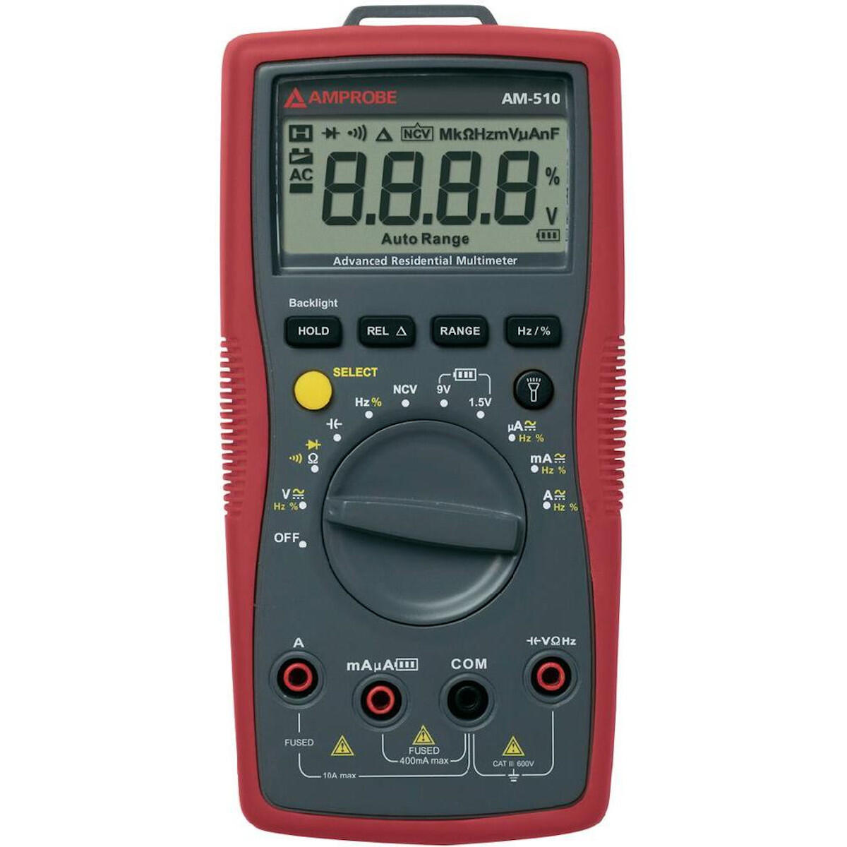 Multimetro Amprobe AM-510-EUR, 600V ca, 10A ca, CAT III. Il multimetro digitale Amprobe AM-510 con impostazione automatica delle scale offre prestazioni robuste e accurate per applicazioni commerciali e residenziali avanzate come il ricablaggio di un quadro elettrico, l'installazione di pavimenti riscaldati e apparecchiature di illuminazione, la risoluzione dei problemi e la riparazione di elettrodomestici, prese elettriche e i problemi elettrici di tipo automobilistico. Il suo livello di sicurezza CAT III e la facilità d'uso lo rendono ideale per applicazioni di multimetro ad alta tensione. Questo innovativo multimetro digitale è dotato di rapidi controlli go/no-go e la torcia incorporata consente di vedere facilmente i cavi e i fusibili in ambienti bui. Inoltre un supporto inclinabile in gomma e un supporto per la sonda offrono una "terza mano" quando è necessario.. Conforme alle norme di sicurezza CAT III 600V Il rilevamento della tensione senza contatto migliora la sicurezza La continuità acustica identifica rapidamente i cortocircuiti e li apre Il test diodo verifica la polarità del diodo La funzione Data hold blocca la lettura sul display per ulteriori analisi La registrazione MIN/MAX registra le misurazioni min/max nel corso del tempo per mostrare le fluttuazioni di tensione La modalità zero relativo visualizza la differenza tra la lettura effettiva e un valore di riferimento memorizzato e può essere utilizzata con qualsiasi funzione o gamma Impostazione automatica e manuale della scala per la massima flessibilità Il display LCD retroilluminato consente di visualizzare più facilmente i risultati