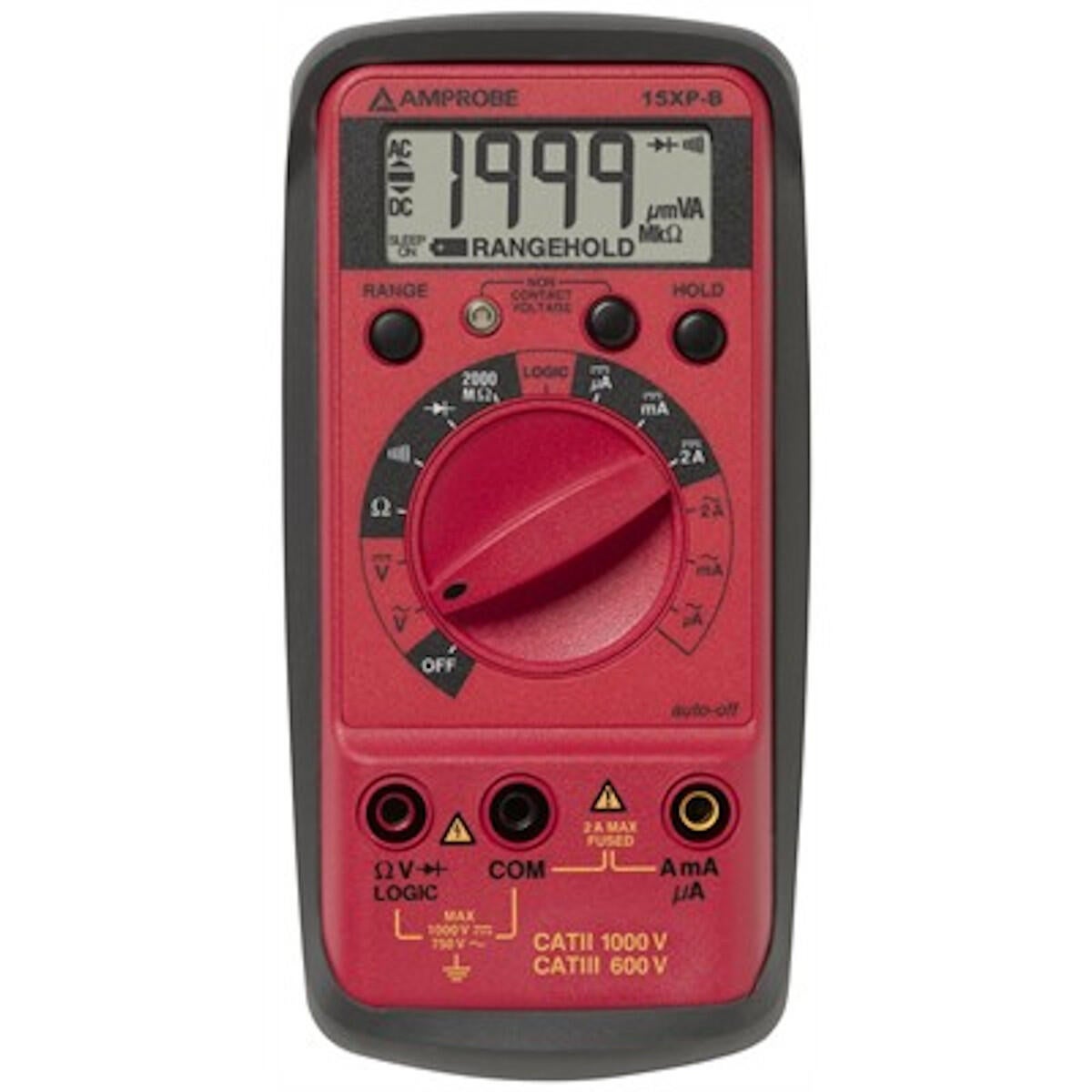 Multimetro Amprobe 15XPB, 600V ca, 2A ca,, CAT II, CAT III. Ideale per ingegneri elettronici e tecnici addetti al servizio sul campo ed è dotato di prova logica TTL per circuiti digitali, test diodo per la risoluzione dei problemi a livello di componente, un intervallo di misurazione di 2000 MΩ speciale e un supporto inclinabile per lavorare comodamente sul banco.. Fornita con Custodia per il trasporto Supporto Magne-Grip™ con cinghia 2 puntali, 1 custodia magnetica Batteria IEC 6LR61 9 V Manuale utente. Multimetro digitale compatto per applicazioni elettroniche e manutenzione sul campo Misura tensione, corrente, resistenza Test di continuità acustica e diodo Funzione di prova logica (TTL). Impostazione automatica della gamma e selezione manuale. Memoria delle misurazioni integrata (Data hold). Contenitore standard resistente agli urti. Spegnimento automatico. Indicatore di tensione senza contatto (NCV). Custodia magnetica (Magne-Grip™)