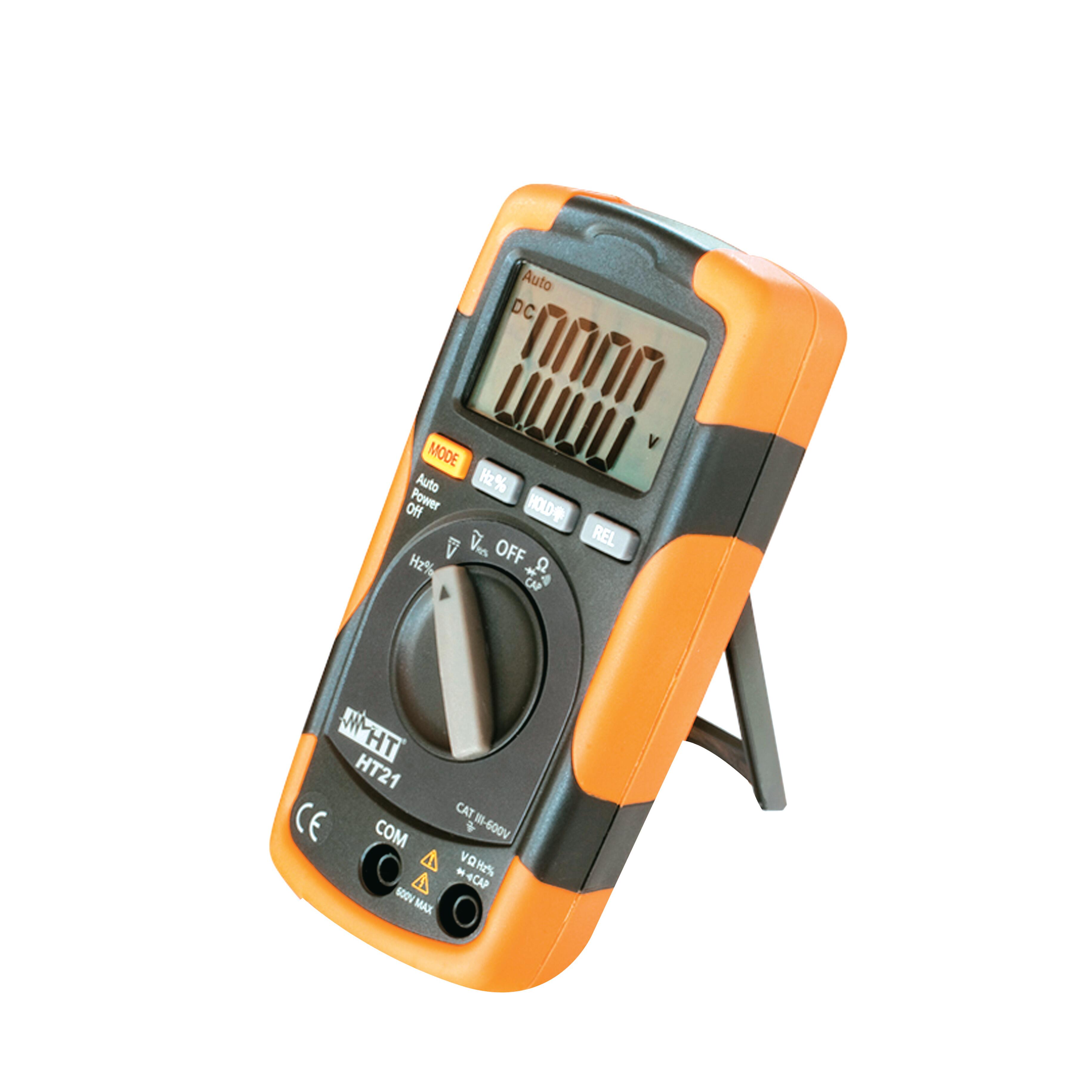 Multimetro digitale compatto in CAT III. É dotato di un ampio display LCD retroilluminato e ogni funzione può essere selezionata tramite l'apposito commutatore. Ulteriore funzione prevista è la Data HOLD per il mantenimento dei valori a display e REL per le misure relative.. La modalità di attenuazione consente il filtraggio dei valori in ingresso che cambiano rapidamente