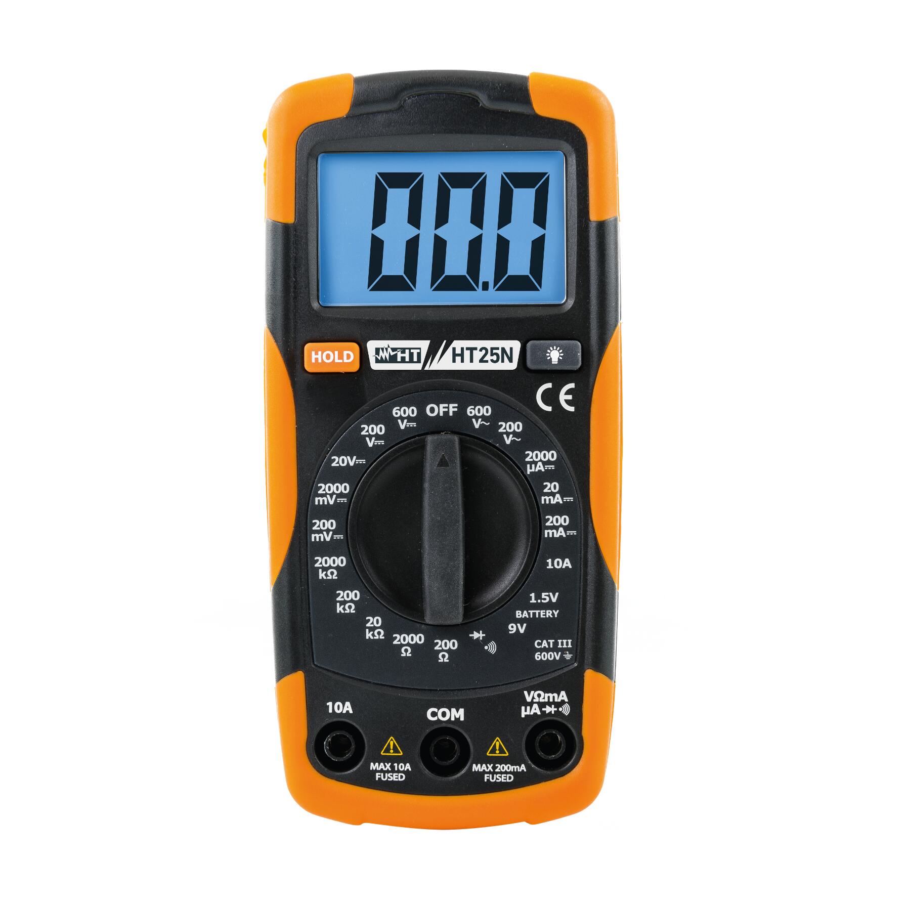 Multimetro digitale compatto in CAT III. Ideale per le misure di Tensione AC/DC fino a 600V e Corrente DC fino a 10A con funzioni complementari di Resistenza, Test Continuità, Prova Diodi e Test batterie alcaline 9V e 1.5V. Indicazione automatica della polarità negativa. Commutatore rotativo di selezione gamme.. É stato progettato in accordo con la normativa di sicurezza IEC/EN61010-1 con protezione in doppio isolamento in CAT III 600V