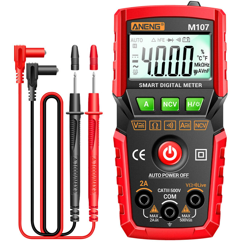 8) Intervallo di corrente CC/Risoluzione/Precisione: 0~2A / 0~1mA / ±(2,5%+8) Intervallo di corrente CA/ Risoluzione/Precisione: 0~2A / 0~1mA / ±(3.0%+8) Gamma di resistenza/Risoluzione/Precisione: 0~20MΩ / 0.1Ω~0.01MΩ / ±(0.8 %+3) Segnale acustico attivato/disattivato: Sì Data Hold: Sì Rilevamento NCV: Sì < br />Rilevamento filo incendio zero: Sì Identificazione automatica: Sì Spegnimento automatico: 15 minuti Schermo: LCD con retroilluminazione< br /> Max. Display: 4000 conteggi Alimentazione: 2 batterie AAA da 1,5 V (NON incluse) Dimensioni articolo: 120,3 * 57,3 * 37,4 mm / 4,73 * 2,25 * 1,47 pollici< br /> Peso articolo: 106 g / 3,74 once Peso confezione: 175 g / 6,17 once Dimensioni confezione: 18 * 10,8 * 4,2 cm / 7,09 * 4,25 * 1,65 pollici Lista di imballaggio: 1 *