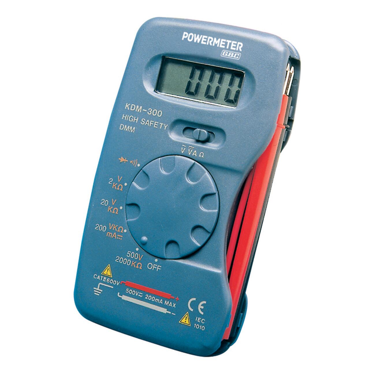 Multimetro digitale tascabile. Display LCD a 3 1/2 cifre 12mm Indicazione automatica della polarità negativa. Commutatore rotante di posizionamento e selettore portate. Custodia similpelle in dotazione.. Tensione CC 2V (±0,5%), 20V / 200V / 500V (±0,8%) Tensione CA 200V / 500V (±1,2%) Corrente CC 200mA (±1,5%) Resistenza 2kΩ / 20kΩ / 200kΩ / 2MΩ (±1,0%) Prova diodi - Prova di continuità Alimentazione batteria 12V alcalina tipo GP23A (in dotazione) Conforme alle normative CE/ IEC 1010/CAT II/EMC/LVD