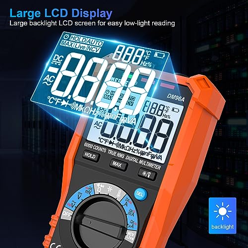 【Alta precisione e versatilità】 6000 conteggi, multimetro digitale Auto-range in grado di misurare: 600mV-1000V AC/DC tensione, 6000uA ~ 10A AC/DC corrente, RMS vero, test di temperatura, resistenza, capacità, frequenza, diodo, test di continuità, test della batteria, identificazione del cavo vivo, test NCV, protezione da sovraccarico di processo a gamma completa. Può essere utilizzato come voltmetro di alta precisione, amperometro, ohmmetro e tester della batteria dell'automobile.