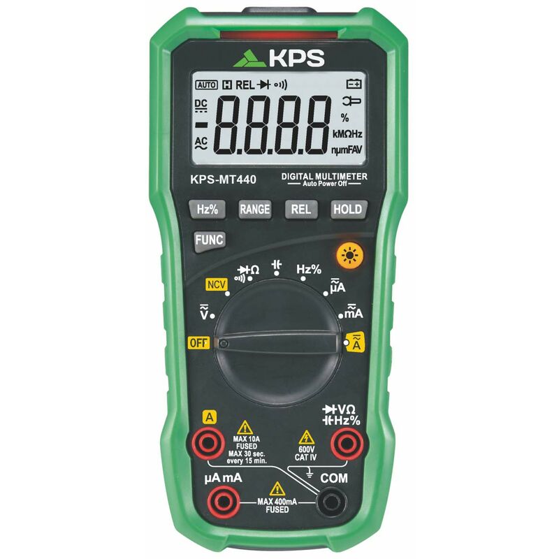 Specifiche tecniche · Visualizza 4000 conteggi · Auto Ranging · Manual Ranging · Spegnimento automatico · Misurazione relativa · Rilevatore di tensione senza contatto · Diodo tensione aperta 1,5 V · Cicalino di continuità
