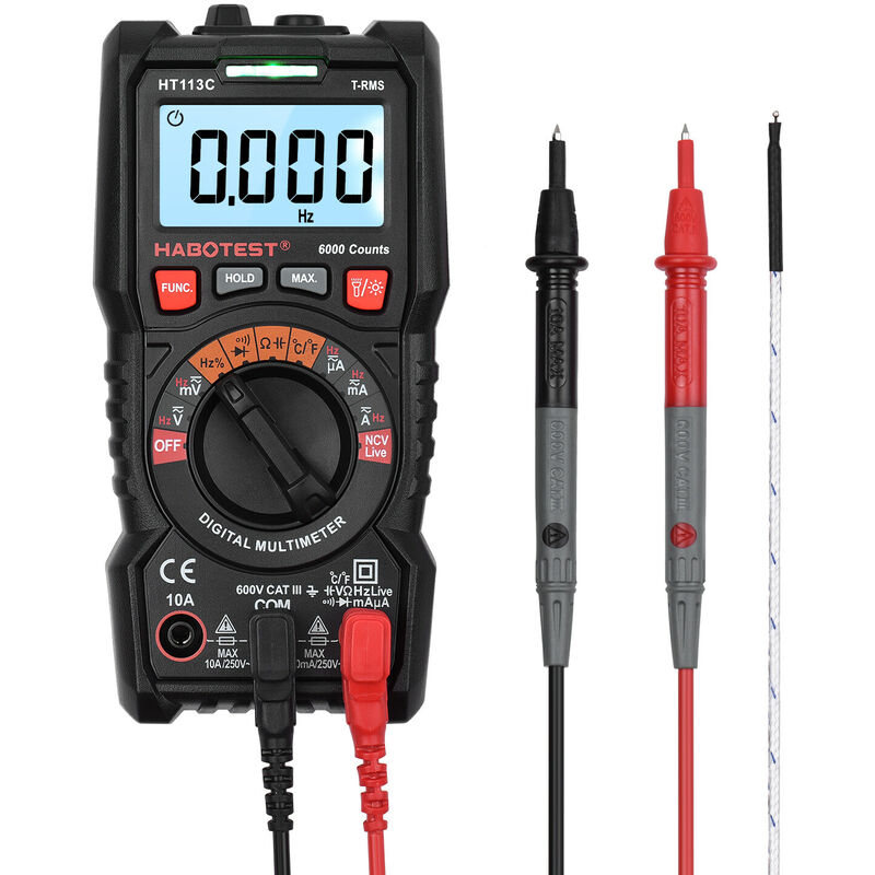ABS Display: display LCD con retroilluminazione, 6000 conteggi Controllo portata: portata automatica Ambiente operativo: CAT.III 600 V, livello di inquinamento 2 Tempo di campionamento: circa 3 volte/secondo Gamma di tensione CC: 600 mV/6 V/60 V/600 V Risoluzione tensione CC: 0,1 mV/ 0,001 V/0,01 V/0,1 V Intervallo tensione CA: 600 mV/6 V/60 V/600 V Risoluzione tensione CA: 0,1 mV/0,001 V/0,01 V/0,1 V Intervallo corrente CC: 600μA/6000μA/60mA/600mA/6A/10A Risoluzione corrente CC: 0,1μA/1μA/0,01mA/0,1mA/0,001A/0,01 A Intervallo corrente CA: 600μA/6000μA/60mA/600mA/6A/10A Risoluzione corrente CA: 0,1μA/1μA/0,01mA/0,1mA/0,001A/ 0.01A Gamma di resistenza: 600Ω/6kΩ/60kΩ/600kΩ/6MΩ/60MΩ Risoluzione resistenza: 0.1Ω/0.001kΩ/0.01kΩ/0.1kΩ/0.001MΩ/ 0,01 MΩ Intervallo di frequenza: 10Hz/100Hz/1000Hz/10KHz/100KHz/1000KHz/10MHz Risoluzione in frequenza: 0,001Hz/0,01Hz/0,1Hz/0,001KHz/0,01 KHz/0.1KHz/0.001MHz Capacità Range: 10nF/100nF/1000nF/10μF/100μF/1000μF/10mF/100mF Risoluzione capacità