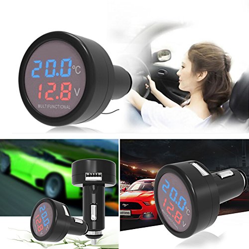 Multimetro digitale volt e temperatura, da 2,1 A, 3 in 1, caricabatterie da auto, porta USB, display temperatura, termometro, voltmetro, da -10 a 80° Termometro per SUV e per camion e autobus da 24 V.