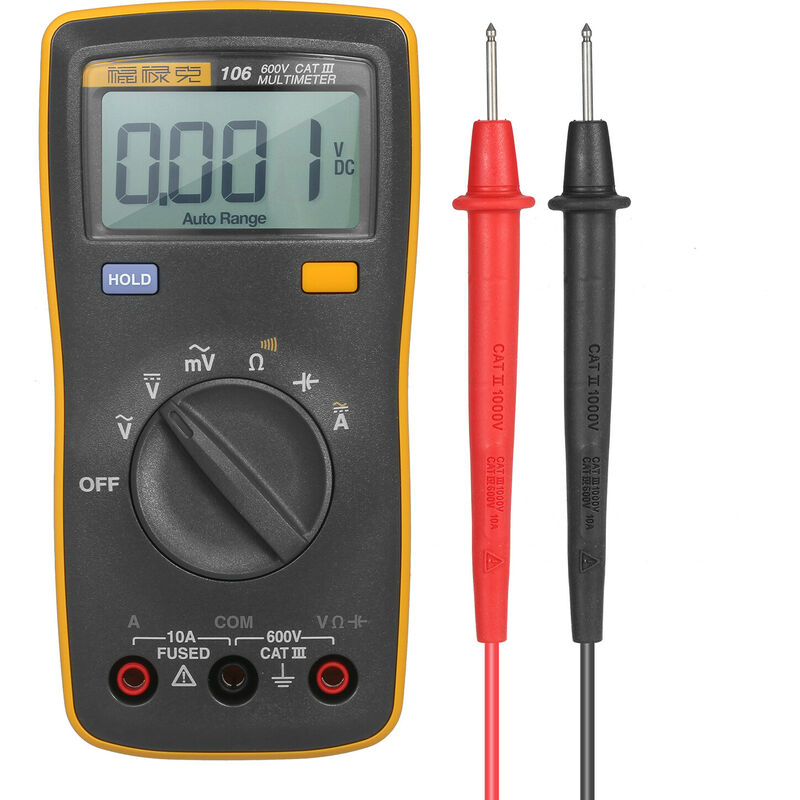 Corrente CC, resistenza, capacità e continuità, applicabili alla misurazione elettronica di base, alla manutenzione elettrica e ad altri campi. Specifiche: Modello: 106 Materiale: ABS Colore: Arancio & Nero Alimentazione: 2 batterie AAA (NON incluse) Durata della batteria: almeno 200 ore Display: 6000 conteggi Intervallo di tensione CC: 6 V / 60 V / 600 V Risoluzione di tensione CC: 0,001 V / 0,01 V / 0,1 V Intervallo di tensione CA: 6 V / 60 V / 600 V Risoluzione tensione CA: 0,001 V / 0,01 V / 0,1 V Gamma corrente CC: 4 A / 10 A Risoluzione corrente CC: 0,001 A / 0,01 A Intervallo corrente CA: 4 A / 10 A Risoluzione corrente CA: 0,001 A / 0,01 A Intervallo mV CA: 600 mV mV AC Risoluzione: 0,1 mV Gamma di resistenza: 400Ω / 4kΩ / 40kΩ / 400kΩ /4MΩ / 40MΩ