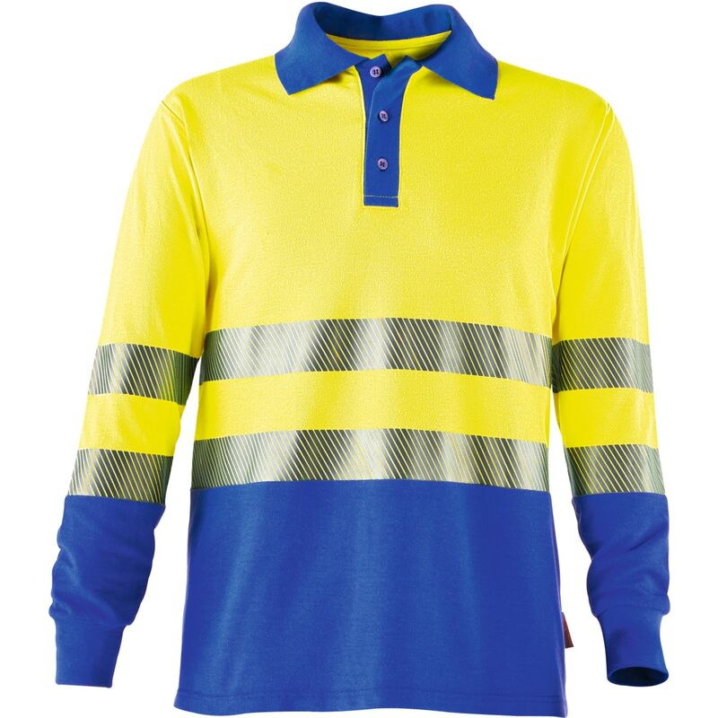 Polo multinorma a maniche lunghe contro calore, fiamme e archi elettrici. Con proprietà elettrostatiche. Elementi a riflessione segmentati ed elastici. Norma: * EN ISO 20471, Klasse 2 * EN 1149-3-5 * EN 61482-1-2, Klasse 1 * EN ISO 11612 A1, B1, C1 Nota: EN 61482-1-2, Classe 2 unitamente alla giacca corta Rofa 091780. Dati tecnici Grammatura del materiale / spessore del tessuto g/m2 220 Candeggiare non candeggiare Lavaggio Colorati 60 °C Asciugatura asciugatura delicata in asciugatrice (bassa temperatura) Colore giallo / blu pervinca Stanghette calore moderato, fino alla temperatura massima di 150 °C Pulizia chimica pulizia delicata con percloroetilene Tipo di prodotto Polo catarifrangente Serie Indumenti multinorma Rofa Genere Unisex Taglia unisex XL