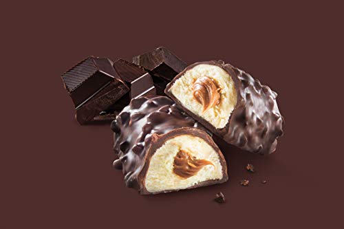 Barretta proteica, con cuore morbido al burro di arachidi e caramello, ricoperta di cioccolato fondente e pezzetti di arachidi