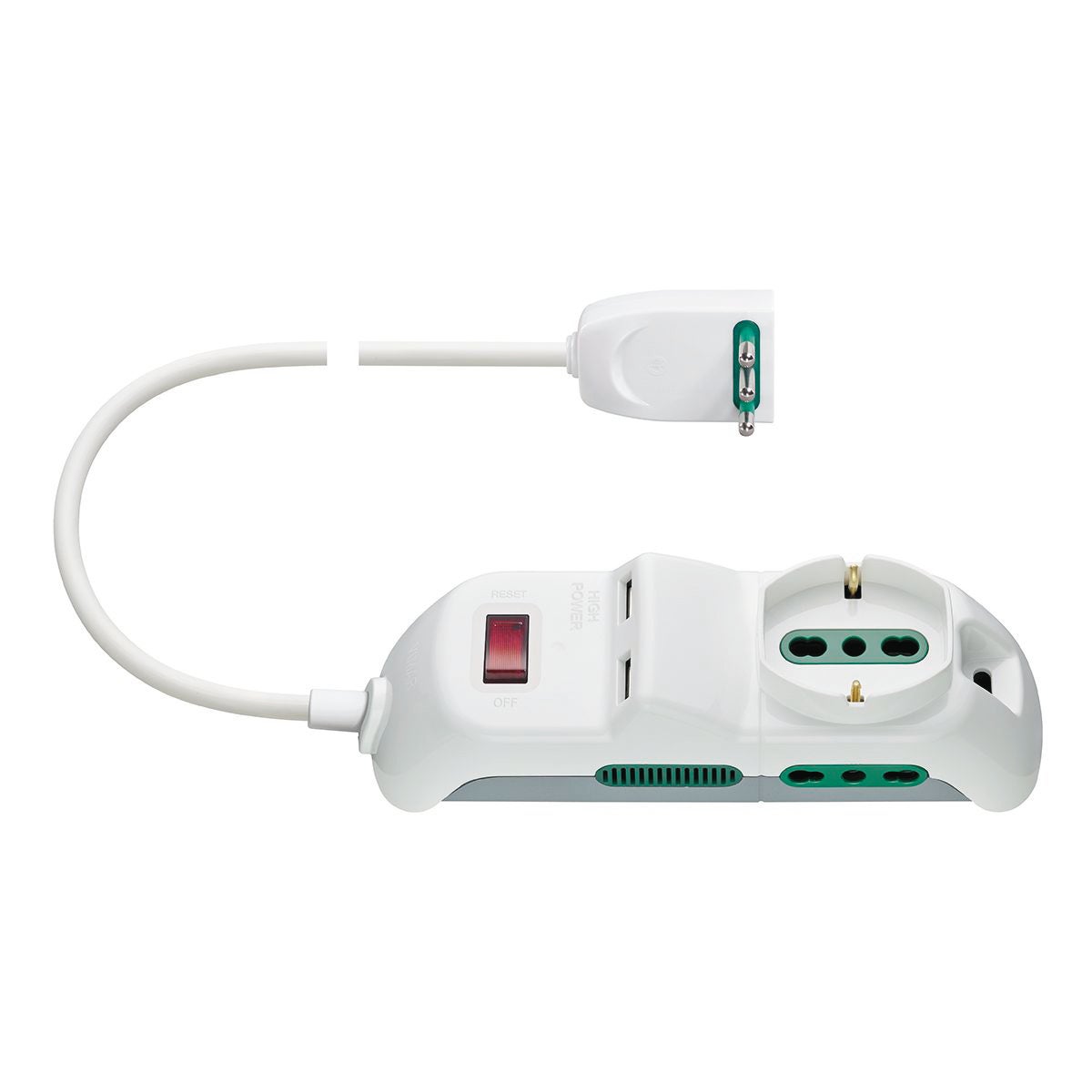 2 prese bipasso + 1 presa universale + 2 prese USB, spina 10A, cavo 1.5M. Con interrutore di sicurezza