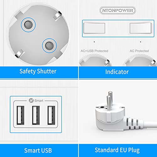 Multipresa, Ciabatta Elettrica con Interruttori e Superiore Protetta da Sovratensioni 4000 Joules, NTONPOWER 8 Prese Schuko, 3 Porte USB, 4000W/16A da Cucina, Ufficio- Bianca