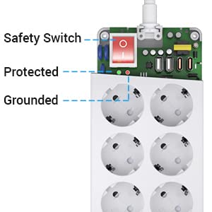 Protezione multipla della presa multipla: Abbiamo impostato una doppia protezione.Gli interruttori sono anche protezione da sovraccarico.Ciabatta con indicatore di funzione per protezione da sovratensione e messa a terra per indicatore di funzione di protezione contro i fulmini. Offre molteplici protezioni per la tua famiglia e i tuoi dispositivi di valore.