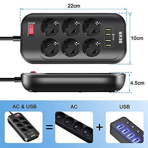BEVA Multipresa Elettrica con 6 Prese di Corrente e 4 Prese USB Veloci, Ciabatta Multipresa con Protezione da Sovraccarico e Interruttore, Cavo da 2 m, 2500 W / 10 A (Nero)