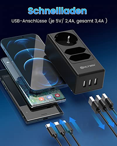 Multipresa da Muro con USB, ONLYWIN 4000W 16A Ciabatta Elettrica con 3 Prese Schuko e 3 Porte USB (5V/3,4A), Multipresa Elettrica Salvaspazio per Viaggio, Casa e Ufficio - Nero