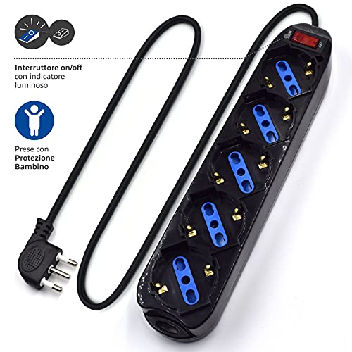 Multipresa a 5 Posti, Ciabatta Elettrica con 5 Prese Italiane 10/16A e Schuko/Tedesche & EW3800 - Prolunga elettrica bianca 3mt, spina Italiana 10A 90° salvaspazio