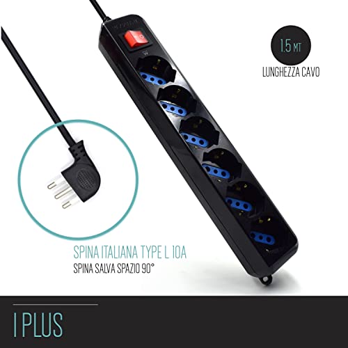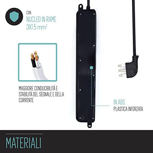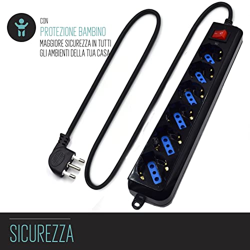 Multipresa a 5 Posti, Ciabatta Elettrica con 5 Prese Italiane 10A e Schuko/Tedesche - Spina Italiana 10A - Potenza 250V/2500W - Cavo da 1,5 Metri, Prese Angolate a 45°