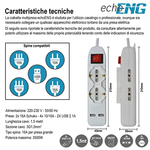 [ Caratteristiche ] La ciabatta multipresa echoENG è dotata di più prese per soddisfare le esigenze di qualsiasi operatore. Sono incorporate 2 prese Schuko 10/16A, 4 prese bivalenti 10/16° e 2 prese USB 2.1A, con le quali è possibile ricaricare i propri dispositivi elettronici come smartphone, tablet, fotocamere e tanto altro