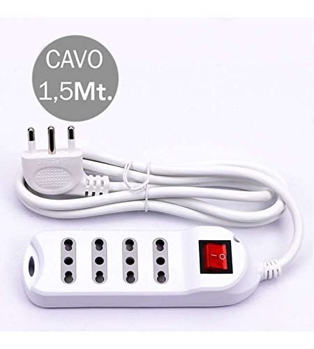 Multipresa con Cavo 1,5mt 4 Prese 10/16A Bipasso con Interruttore Luminoso e Spina 16A, Bianca
