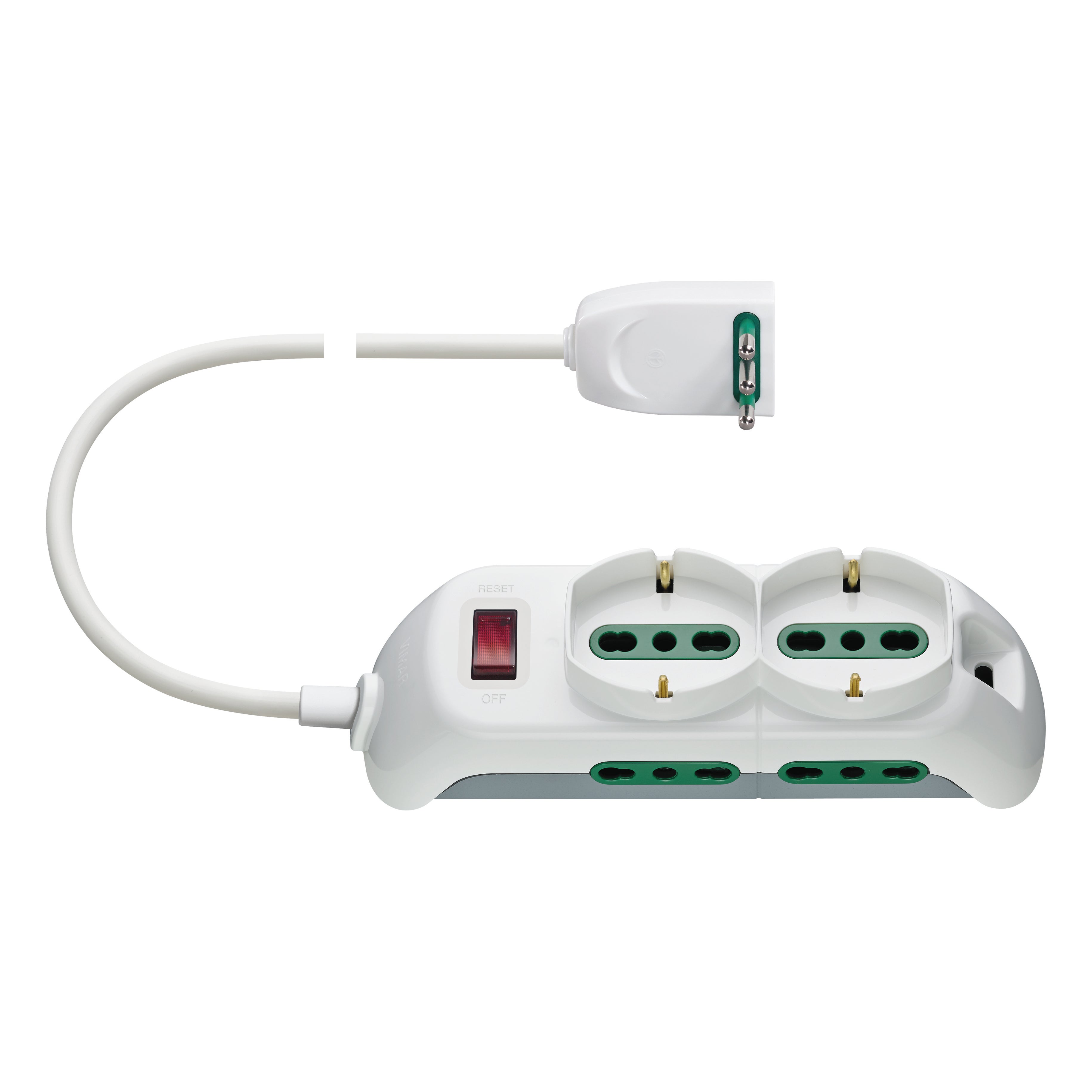 Composta da 4 prese bipasso, 2 prese universali, spina 10A piatta.. Dotata di magnetotermico, salvatensione, salvafulmine, prese rotanti, interruttore luminoso