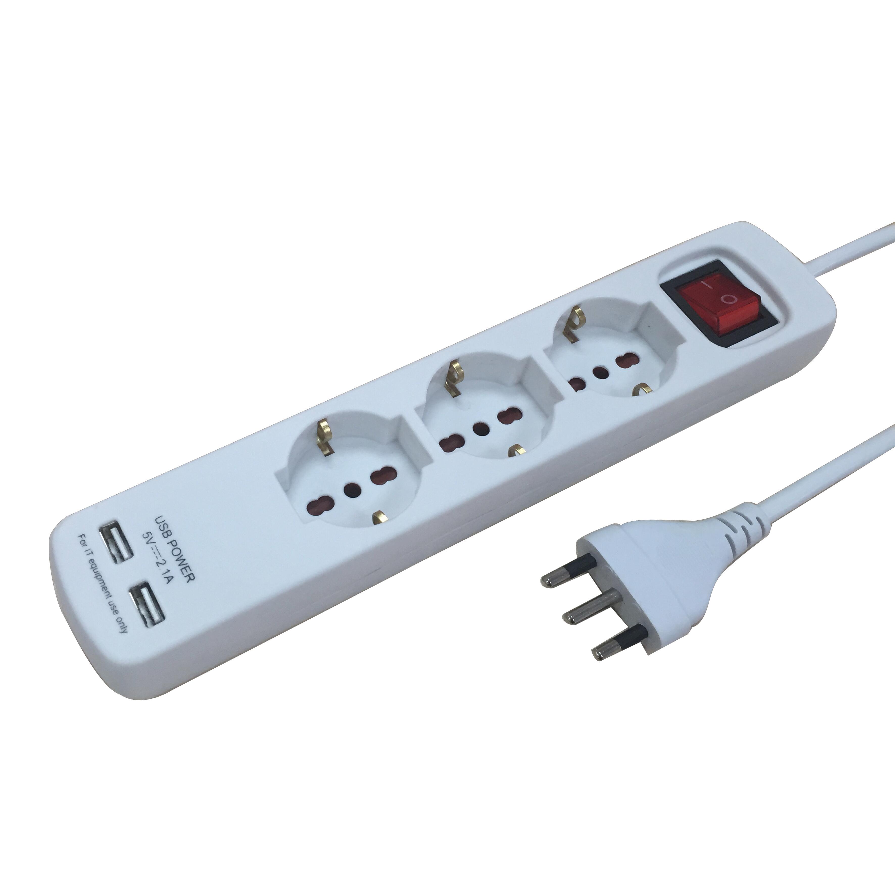 Composta da 3 prese universali, 2 prese USB, cavo da 1 m, spina 16A diritta. Dotata di interruttore luminoso