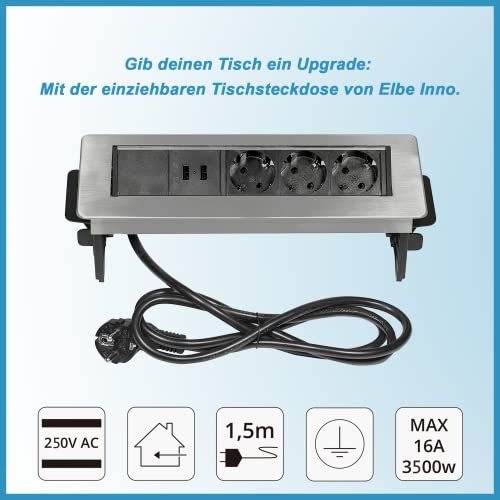 Elbe Inno Multipresa a scomparsa da incasso, con 3 prese Standard Tedesco. Presa multipla da incasso con 2 USB, in acciaio inox per tavolo, scrivania EL4703UM