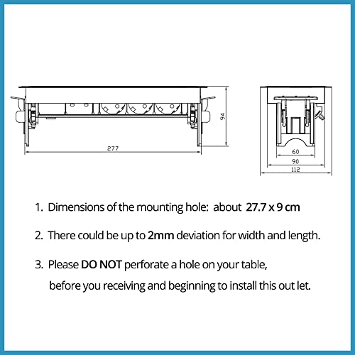[ Parametri ] Presa a scomparsa - Lunghezza del cavo di alimentazione è circa 150 cm. Dimensione di riferimento per l'installazione: 277mm x 90mm.