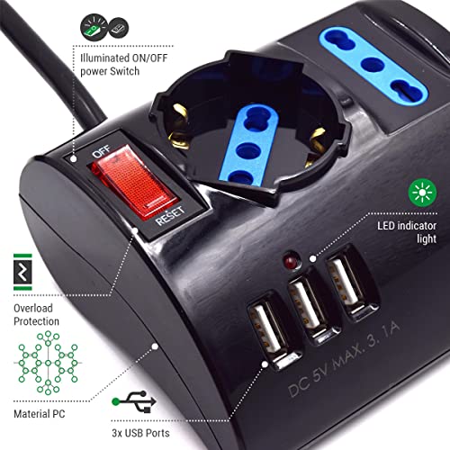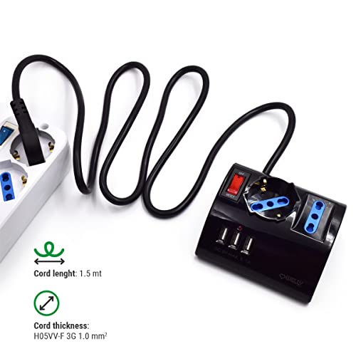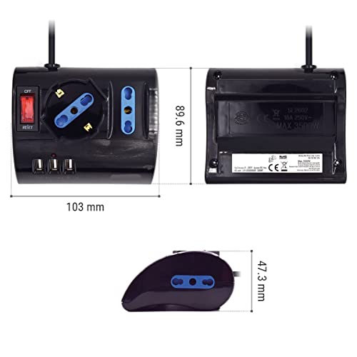 3 POSIZIONI ELETTRICHE: 3 prese (2 Bipasso ITA 10/16A e 1 Schuko), 3USB, Ciabatta dotata di fori con protezione per bambini. Ciabatta Elettrica Multipresa Protetta, Protezione da sovraccarico, Spina 16A, Interruttore di sicurezza. In caso di sovraccarico, l'interruttore delle ciabatte elettriche si aprirà automaticamente.