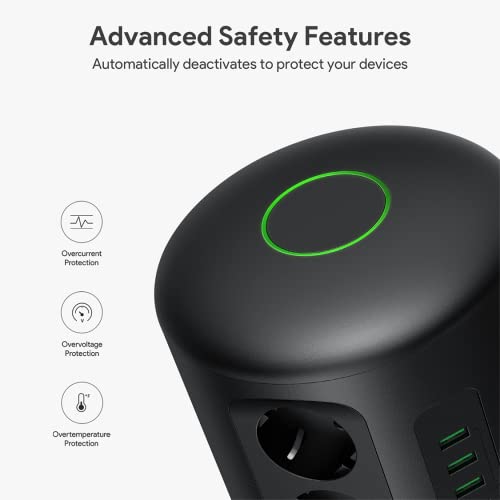 【Torre multipresa 18-IN-1】 Questa torre multipresa con protezione da sovratensioni a 12 prese è progettata per supportare 110 V-240 V, 6 porte USB 5 V/2,4 A (totale max. 6 A), in grado di soddisfare la richiesta di alimentazione di più dispositivi allo stesso tempo e migliorare l'efficienza del lavoro.