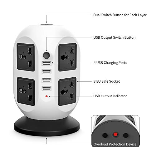 Multipresa Verticale a Torretta, Ciabatta Multipresa Elettrica con 8 Prese Universali e 4 Porte USB 3 Interruttori Indipendenti, Presa di Corrente Protezione di Sovraccarico 2500W (Nero)