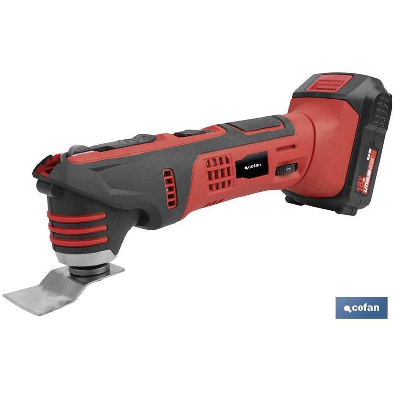 Multiutensile con batteria agli ioni di litio da 18 V con sistema di cambio rapido degli accessori. Accessori inclusi: caricabatterie, batteria, triangolo di levigatura, sega e raschietto. Permette di tagliare, raschiare e levigare materiali plastici