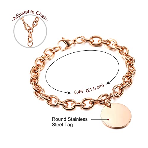 Specifiche di colore e dimensioni - Due colori e due stili di bracciale tra cui scegliere, colore argento e oro rosa, forma rotonda e a forma di cuore. Il diametro dell'etichetta rotonda è di 20 mm, l'etichetta a forma di cuore è di 25 mm. Lunghezza del braccialetto: 215 mm (8,46 pollici).