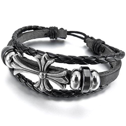 MunkiMix Lega Vera Pelle Lega Bracciali Bracciale Braccialetto Bangle Polsino Nero Tono Argento Marrone Celtico Celtic Medieval Croce Surfer Surfista Avvolgere Regolabile Uomo,Donna