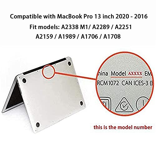 Custodia per Apple MacBook Pro da 13 pollici. Questa custodia per MacBook Pro è solo per il nuovo Apple MacBook Pro 13" del 2020 2019 2018 2017 2016 con Touch Bar e A1708 senza Touch Bar, modello A2338 M1 A2289 A2251 A21. 59 A1. 989 A1706 A1708. Si prega di verificare il numero di modello "AXXXX" sul retro del MacBook prima dell'acquisto. Assicurarsi di scegliere esattamente il numero di modello che corrisponde al titolo.