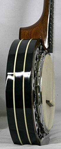 Musikalia Banjo a 5 corde "Finger-style" doppia cassa, corpo impiallacciato in ebano con ricco intarsio e doppio perfilo in celluloide madreperlata lavorata manualmente con seghetto al traforo, manico a riccio, di liuteria