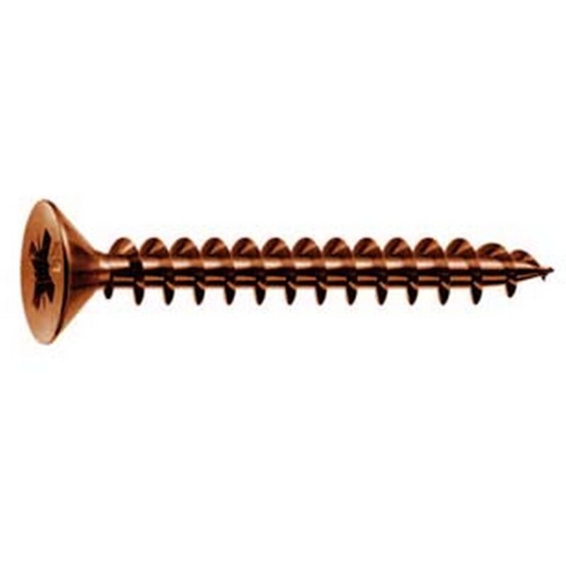 Tutta filettata, vite universale adatta per l?avvitamento senza preforo su pannelli truciolari, legni naturali scuri, elementi di ferramenta bronzata, trattamento galvanico di bronzatura, riporto elettrolitico di rame (spessore 6 micron) con ossidazione c