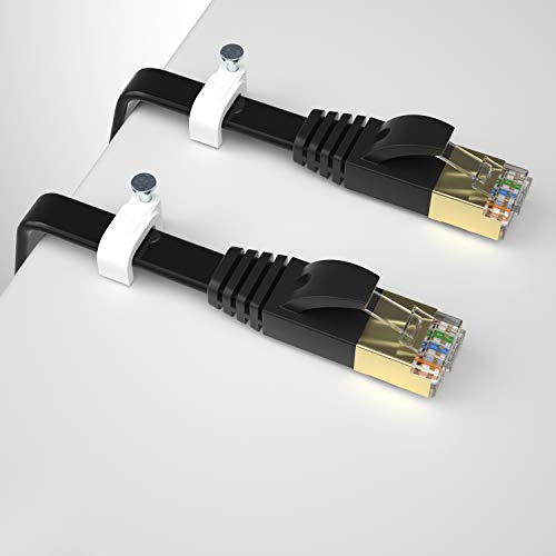 DESIGN ULTRA SOTTILE DI PRIMA CLASSE: Confezione da 2 x 3 m di cavo patch SFTP (doppino ritorto schermato) 32AWG Cat7 con connettori RJ45 (Nero e Bianco) include 25 x fermacavi + 25 x fascette per cavi per installazione efficiente. Il design piatto e sottile aiuta a evitare cavi aggrovigliati e consente di risparmiare spazio, sono super flessibili quando vengono eseguiti sotto il tappeto o piegati sul piano della sua sezione sottile come porte, angoli, cassetti ecc.