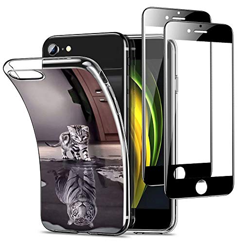 MUTOUREN Cover Compatibile con iPhone SE 2020/iPhone 8/iPhone 7, Custodia TPU Morbido Sottile e Trasparente Silicone Gel Case con 2 Pz Pellicola Vetro Temperato - Gatto e tigre