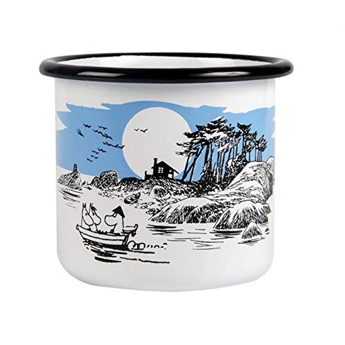 Questa tazza di smalto da 3,7 dl presenta Moomintroll, Snorkmaiden e Moominpappa su una barca di fronte a una bellissima isola.