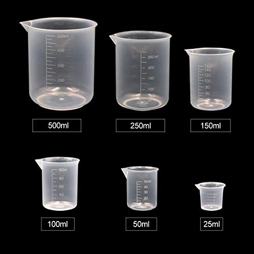 MUYIRTED Bicchieri Graduati in Plastica Graduati 6 Pezzi, Bicchieri Graduati per Laboratorio Scientifico, Misurino per Liquidi - 25ml 50ml 100ml 150ml 250ml 500ml