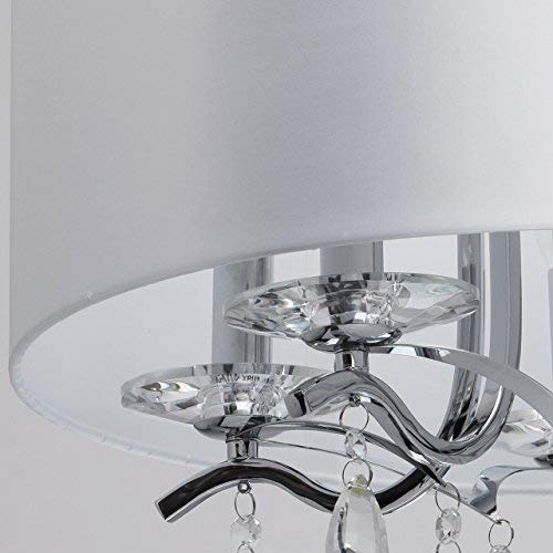 Struttura in metallo cromato lucido. Pendenti in cristallo trasparente. Paralume in tessuto bianco.