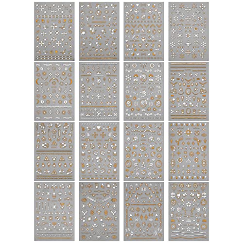 MWOOT 16 Fogli Oro D'argento Adesivi Unghie Nail Art, 3D Autoadesivo Gold Nail Stickers Decals Fiori Cuori Designs, DIY Unghie Adesivi Manicure Accessori per Fai Da Te Salone Nail Decorazione
